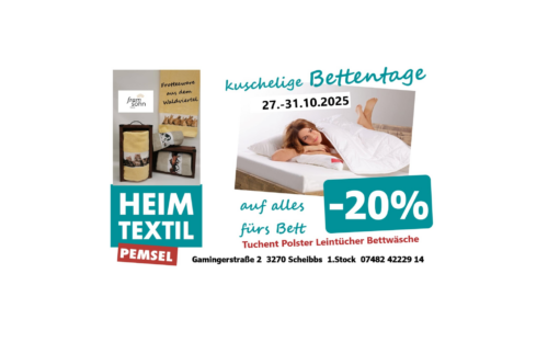 Träumen war noch nie so schön! –20 % auf alles fürs Bett! Mach dein Schlafzimmer zur Wohlfühloase – jetzt ist der perfekte Moment dafür! Erhalte 20 % Rabatt auf unser komplettes Bettensortiment: 🛏️ Einziehdecken 🛌 Polster 🌙 Leintücher ✨ Bettwäsche Weich. Hochwertig. Gemütlich. Alles, was du für traumhaften Schlaf brauchst – jetzt zum Traumpreis! 📅 Nur für kurze Zeit! 📍 Besuche uns im Geschäft